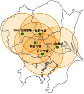 私たちは、埼玉県戸田市・熊谷市、群馬県高崎市、栃木県佐野市に営業拠点を持ち、関東地方における南北、 東西それぞれの交通網の軸を抑え、主要消費地をくまなく網羅することで、需要にフットワークよく対応して きました。今後も一層の流通網の整備に務め、スピーディーな商品供給に努めていきます。 |